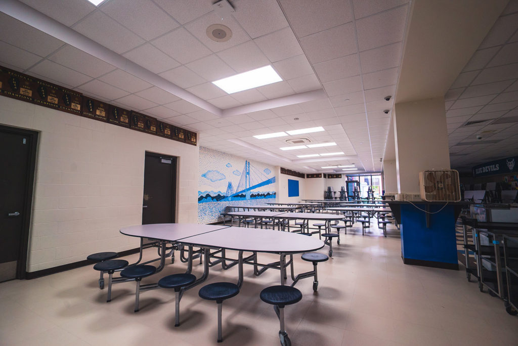 Cafeteria – the existing cafeteria had a capacity of 553 students and was expanded by 1,782 s.f. to accommodate the extra students. Improvements include new tables with attached seating, a new snack room with a coffee bar and new kitchen equipment to allow more meals to be served. The configuration on how food is served was revised for the extra students and new food serving lines were added with tray slides. The existing carpet flooring was removed and replaced with luxury vinyl tile with color patterns to delineate the aisles.